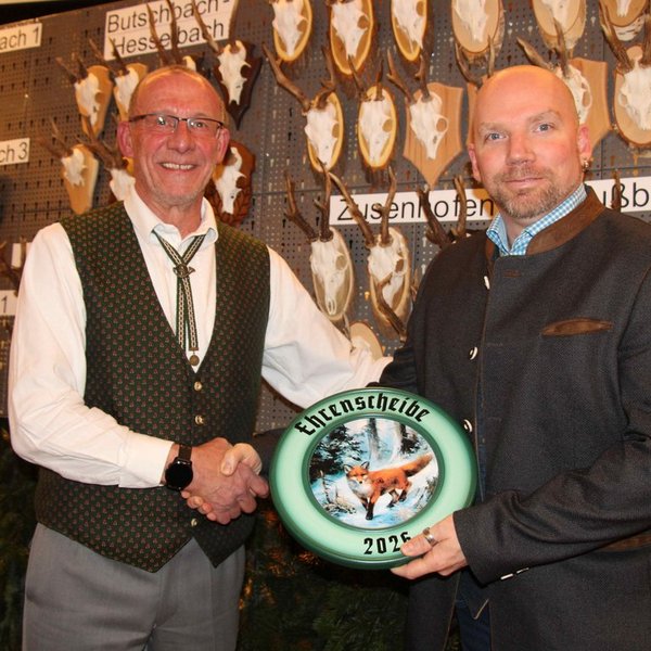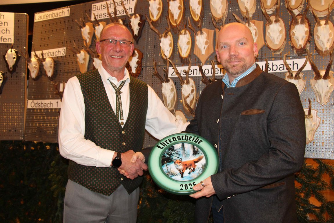 Mitgliederehrungen beim Hegering Vorderes Renchtal mit Ehrenurkunde, Treuenadel des Deutschen Jagdverbands und Ehrenfanfare für Herbert P.M. Ensel (25 Jahre), Karl Hildenbrand (50 Jahre), Franz Schwarz (50 Jahre), Manfred Just (40 Jahre), Janosch Endstrasser (Ehrenscheibe) durch stellvertretenden Hegeringsleiter Franz Sester und Hegeringsleiter Stephan Sester (Bild links) sowie stellvertretenden Kreisjägermeister Gerd Münchenbach (Bild rechts).